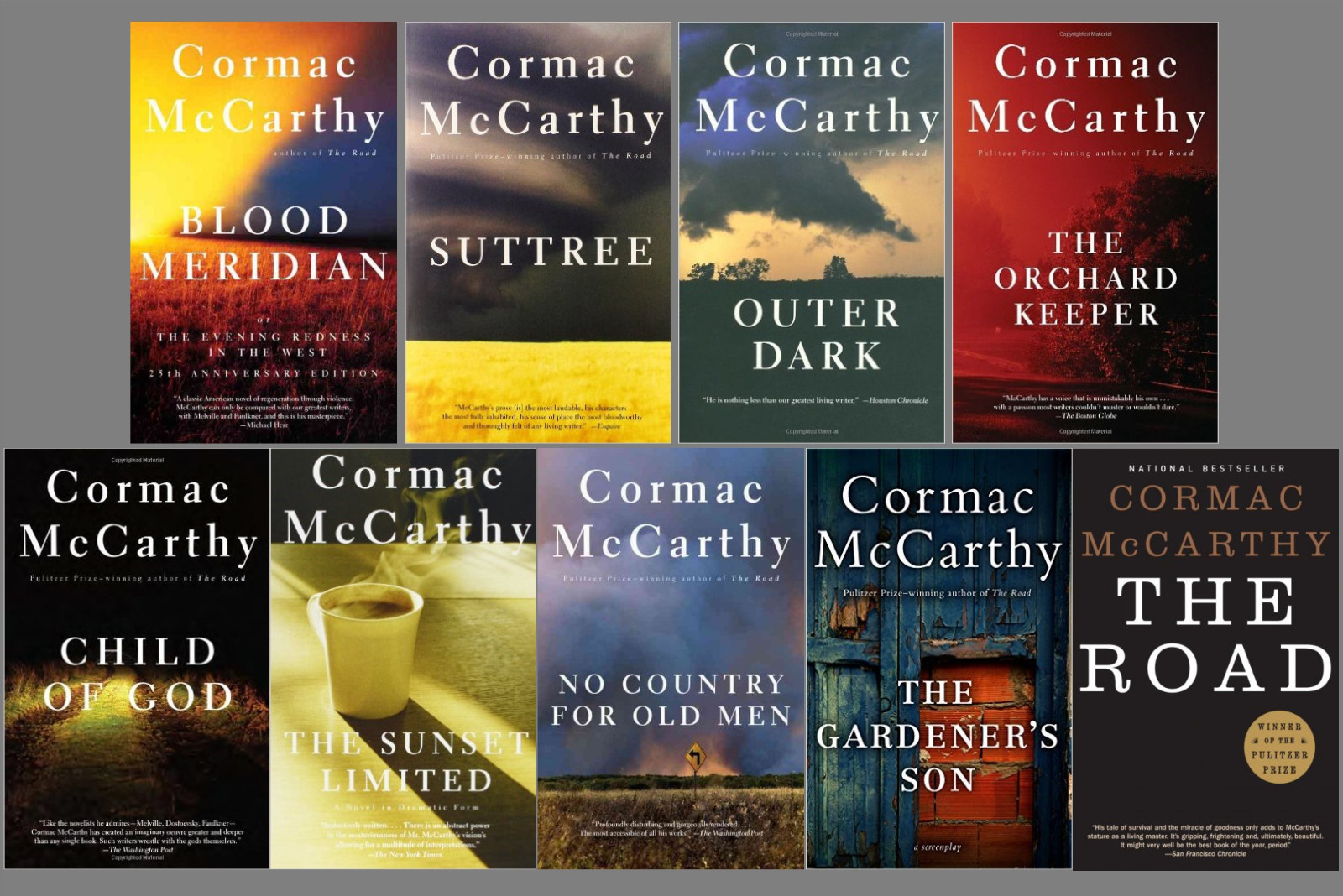 His 2005 novel No Country for Old Men was adapted into an Academy Award-winning film by the Coen brothers, and his harrowing post-apocalyptic tale The Road (2006) won the Pulitzer Prize for Fiction and was also made into a major motion picture. Both works brought him mainstream recognition and a broader readership later in his career.